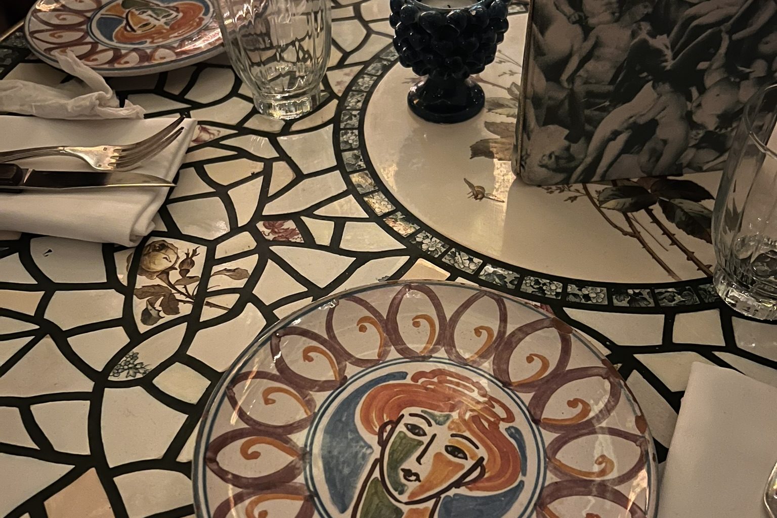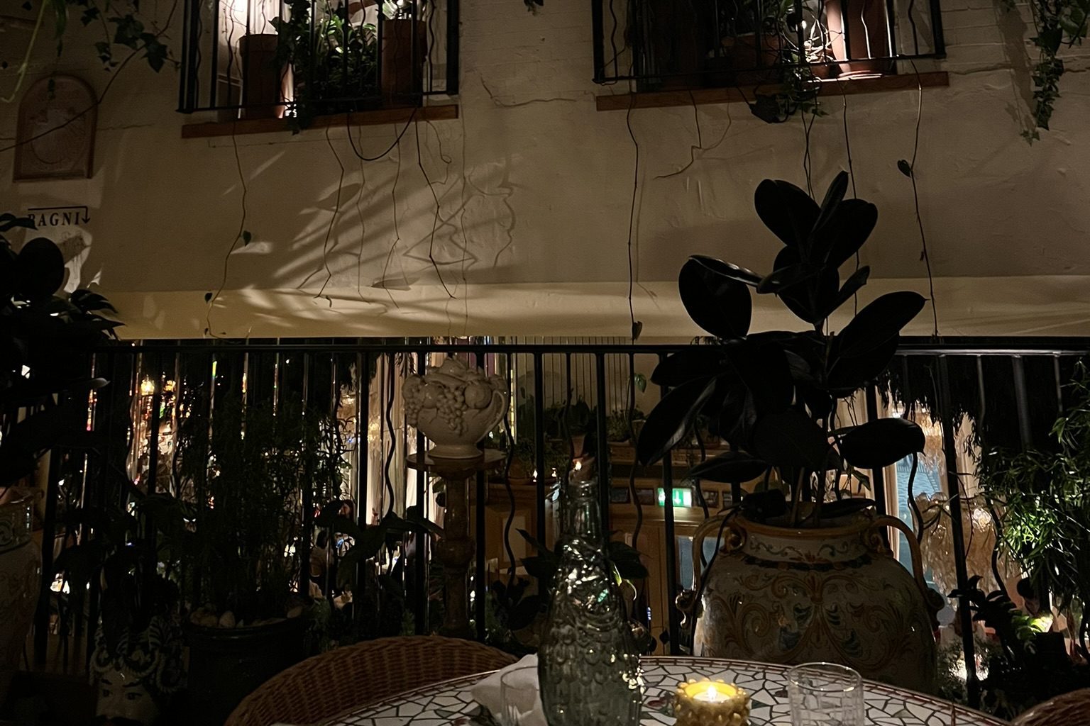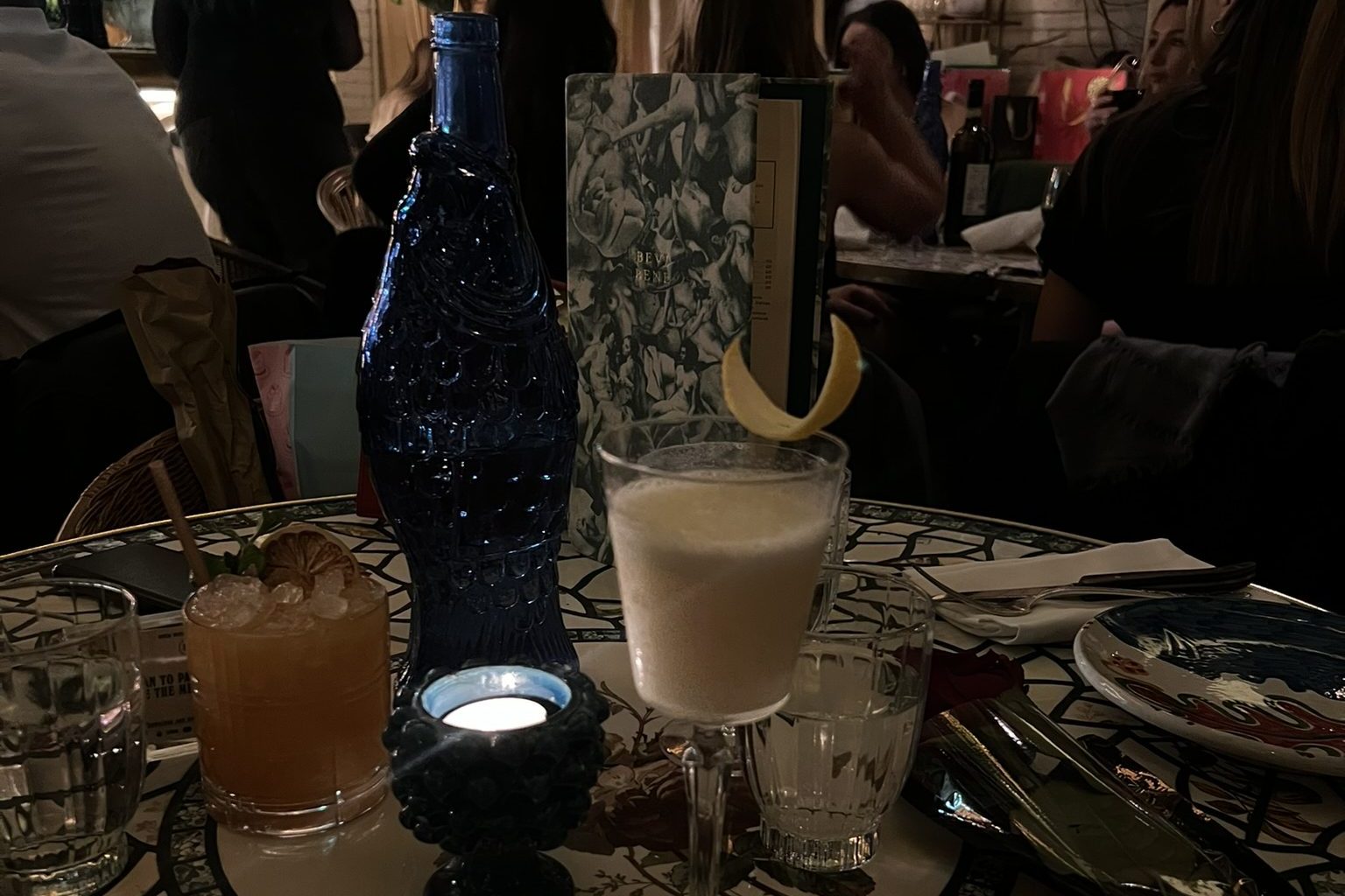 Coming to this sobering realisation, I decided to head back to the direction of the restaurant and sit at our table before the girls arrived. A large wooden door with a gleaming gold handle opened up to reveal large velvet draping in a shade of ruby red. Your eyes immediately fixed onto the golden marble staircase. The ground floor is decorated with large trees and twines which obscure lavish bars and various framed prints which reflect a sense of 1960s nostalgia. Light pink chandeliers hang low and loud conversation competes with the eclectic décor to fill the room.