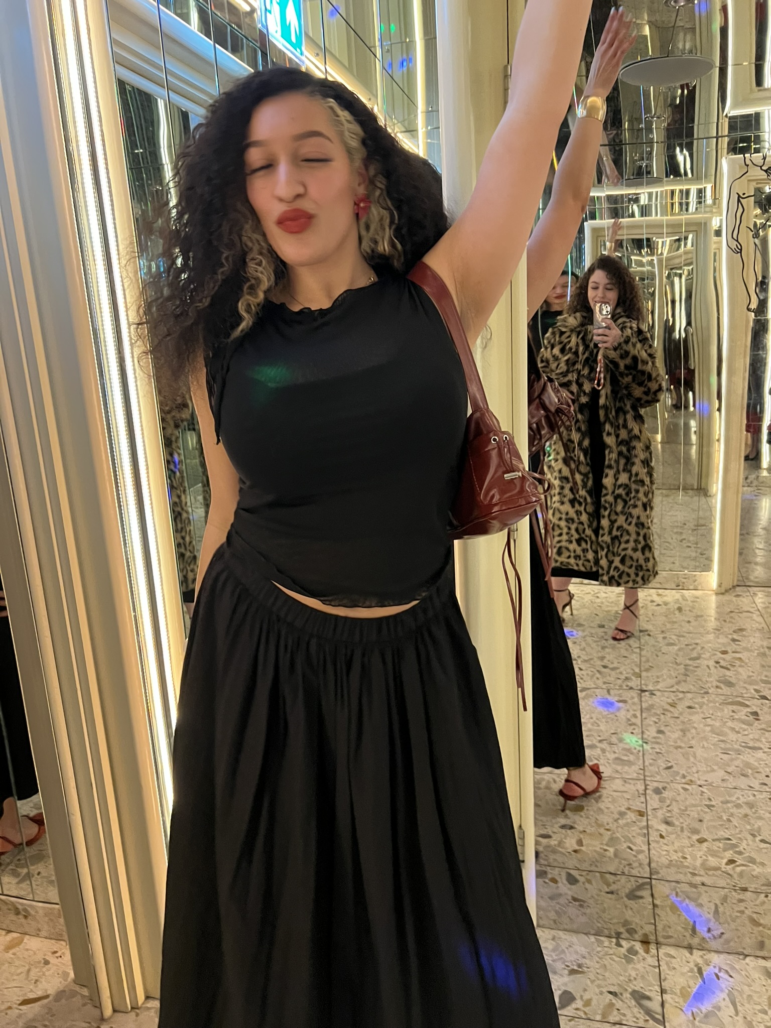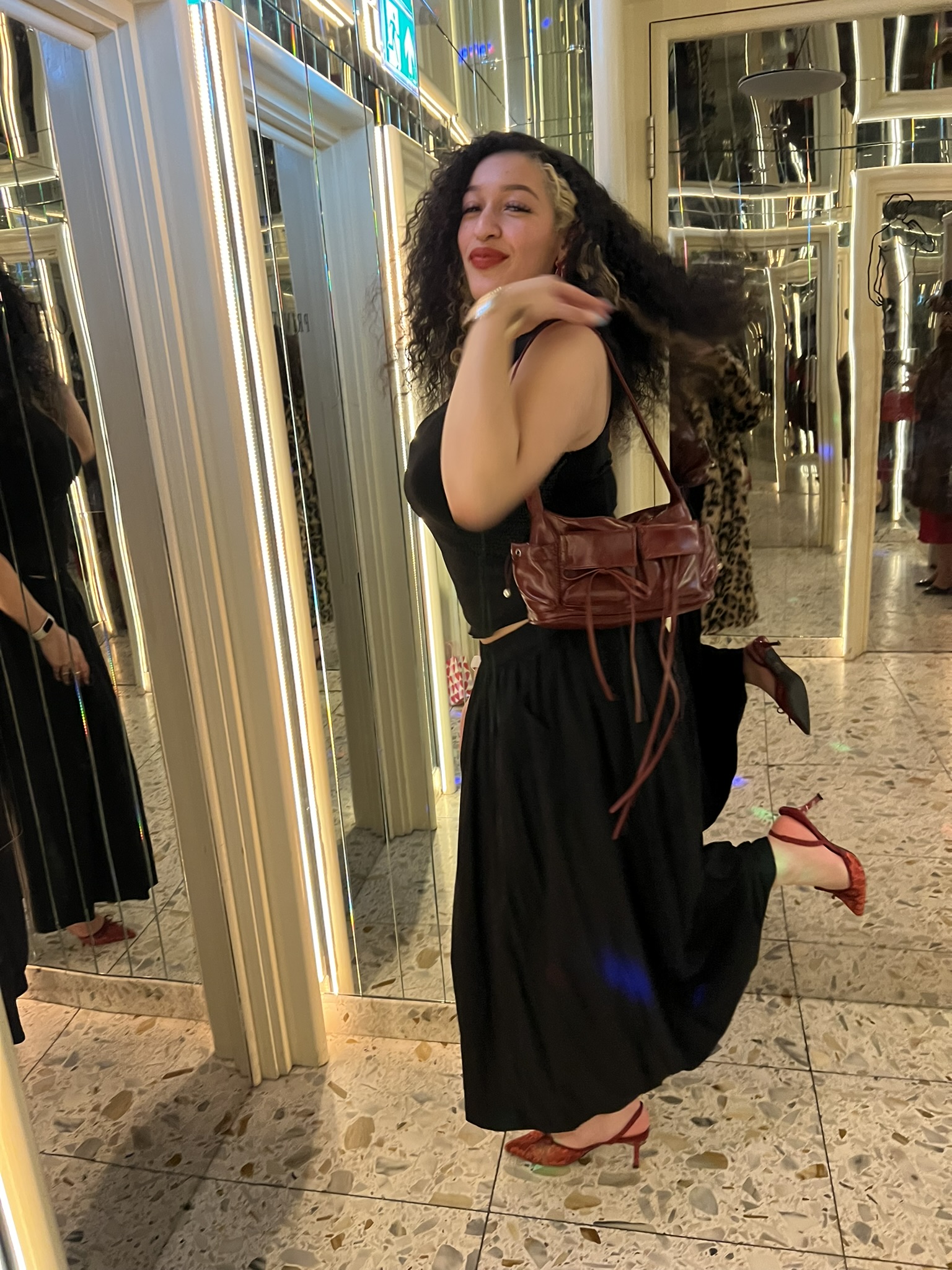 A skirt made for movement: Sheer top, Daisy Street, skirt, Primark, red bow bag, Vinted, pointed slingback heels, Boohoo, hibiscus flower earrings, Etsy, gold cuff bangle, Primark